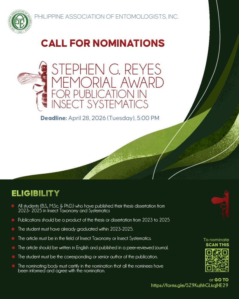 The Stephen G. Reyes Memorial Award in Insect Systematics was created to commemorate and honor the dedication of Dr. Reyes in the field of Insect Taxonomy and Systematics. His passion for Apoidea taxonomy is immeasurable. This award encourages students working in Insect Taxonomy and Systematics to strive for excellence. Hence, this reward is given to the student for Best Publication in Insect Taxonomy and Systematics.